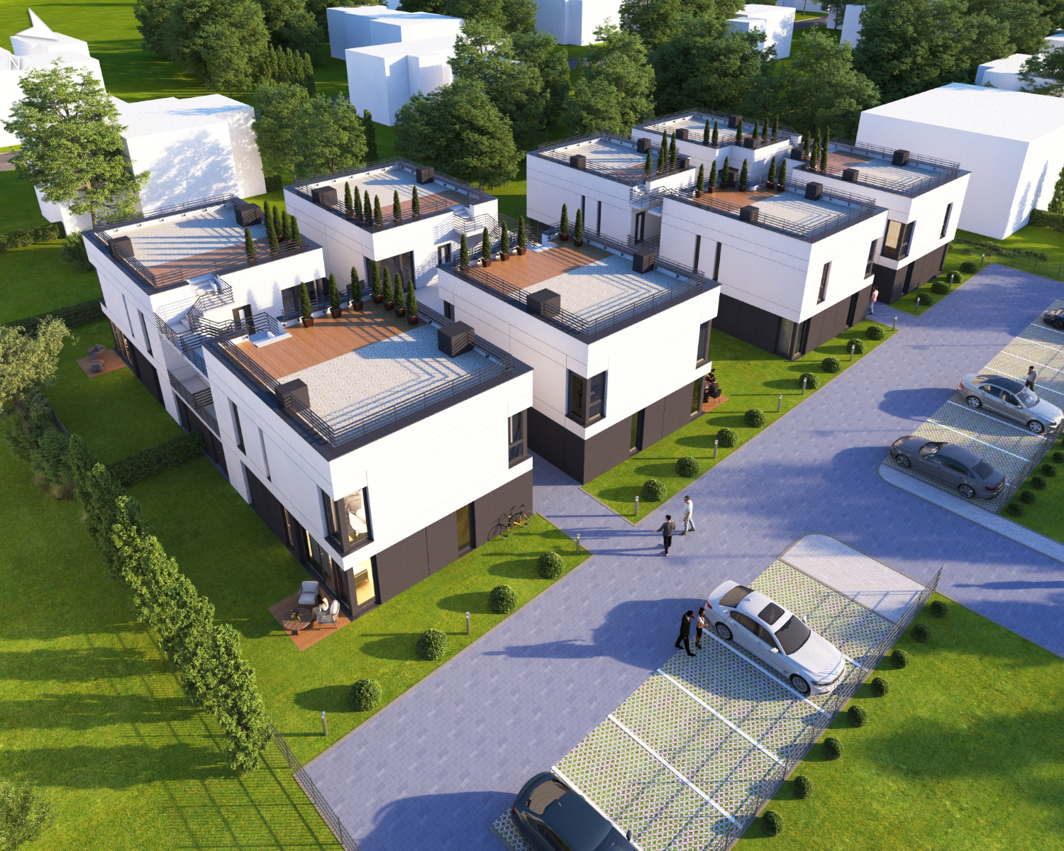 Dużym atutem inwestycji są dodatkowe przestrzenie, przynależne do poszczególnych lokali. Apartamenty na parterze mają prywatne ogródki, natomiast mieszkania na piętrze – duże tarasy, zapewniające komfortowy wypoczynek na świeżym powietrzu. Dla każdego lokalu przewidziane jest jedno miejsce postojowe dla samochodu. Większość apartamentów ma także komórki lokatorskie. Teren osiedla jest zamknięty i zagospodarowany – mieszkańcy mają na nim do dyspozycji wspólne zielone skwery.
