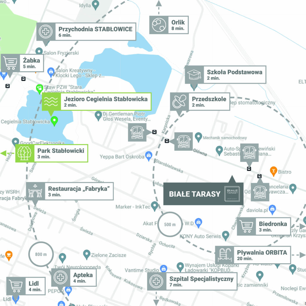Zobacz w Google MapsOkolica Białych Tarasów sprzyja odpoczynkowi – jest cicho, spokojnie oraz bardzo bezpiecznie. Pieszo w kilka minut dotrzesz do jeziora Cegielnia Stabłowicka i Parku Stabłowickiego przy Bystrzycy, gdzie możesz biegać, jeździć na rowerze lub po prostu spędzać czas na łonie natury. Blisko również do wielu przydatnych na co dzień miejsc. W zasięgu krótkiego spaceru znajdują się sklepy spożywcze, markety, punkty usługowe, paczkomaty, lokale gastronomiczne, obiekty sportowe oraz placówki medyczne. Rodziny z dziećmi na pewno ucieszy fakt, że od najbliższego przedszkola i szkoły będzie dzielić je zaledwie 600 metrów.
