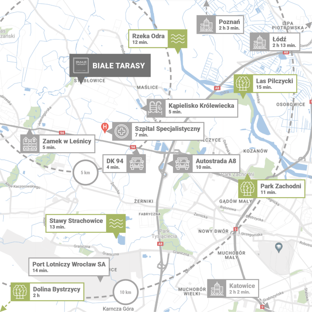 Białe Tarasy położone są we Wrocławiu przy ul. Głównej 32A i 34. To świetnie skomunikowana okolica, zapewniająca szybki dojazd do wielu ważnych lokalizacji. Zaledwie 10 min od inwestycji znajduje się Autostradowa Obwodnica Wrocławia, dzięki której komfortowo możesz podróżować po całym regionie. Blisko apartamentów również kilka przystanków autobusowych i dworzec Wrocław Pracze. Dojazd do ścisłego centrum miasta zajmuje ok. 20 min. Niedaleko także do atrakcyjnych terenów rekreacyjnych – Lasu Mokrzańskiego, Zamku w Leśnicy czy Wzgórza Maślickiego nad Odrą.